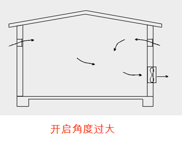▲靠近風(fēng)機(jī)的側(cè)風(fēng)窗開啟角度較小,遠(yuǎn)離風(fēng)機(jī)的側(cè)風(fēng)窗開啟角度較大,確保風(fēng)量均勻;